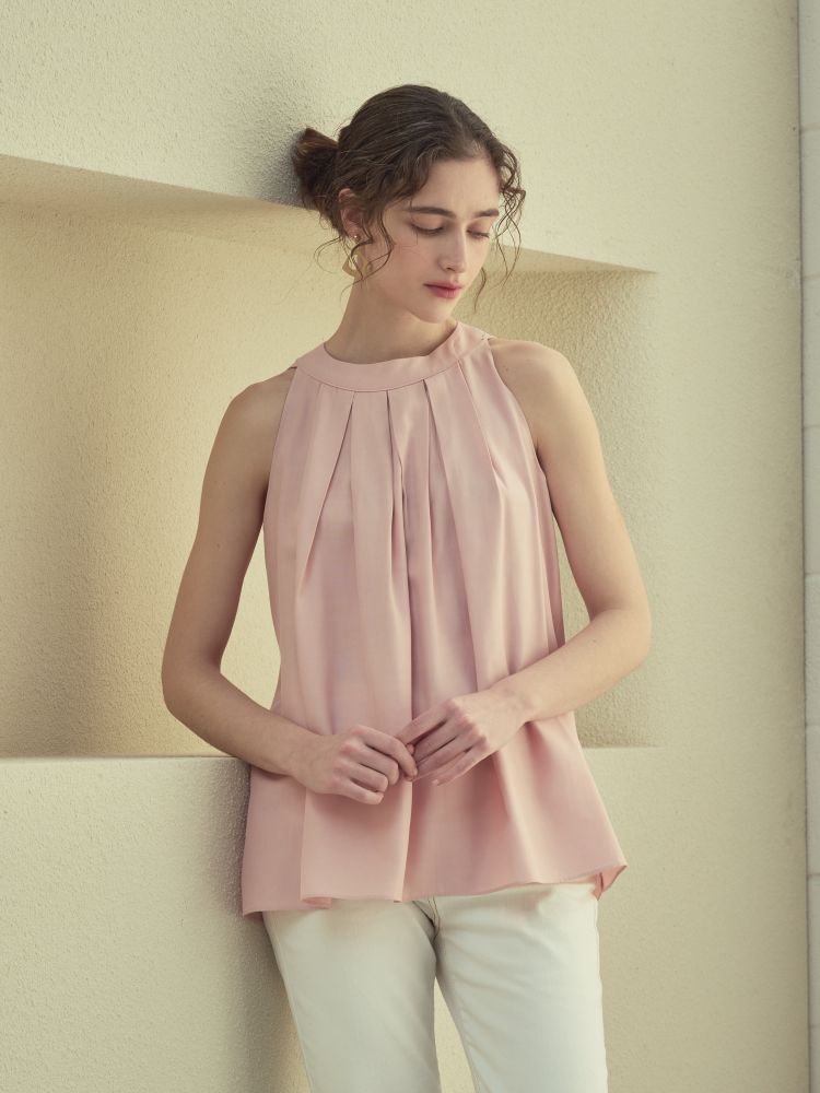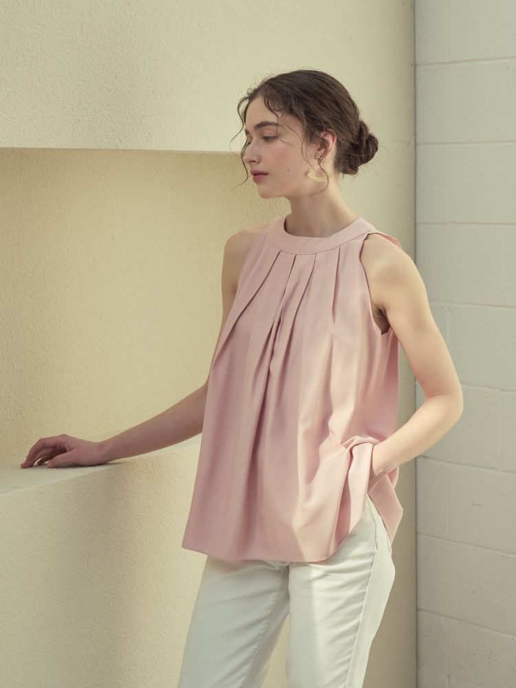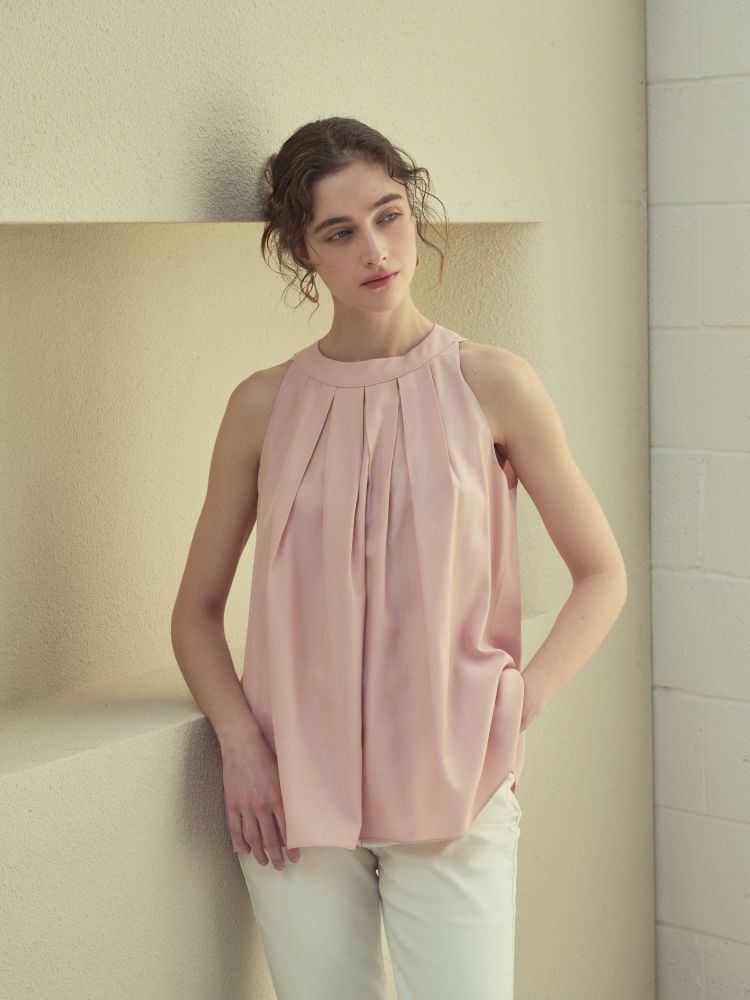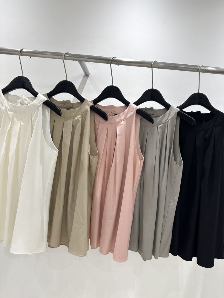 고급 폴리소재. 핀탁디테일과 홀터넥 디자인으로 여성스러우며 다양하게 코디 활용 가능합니다.