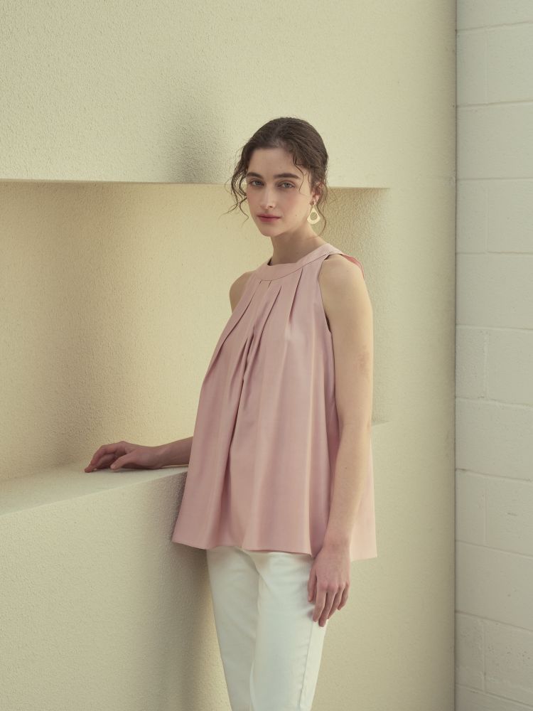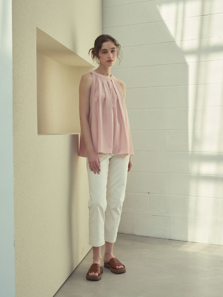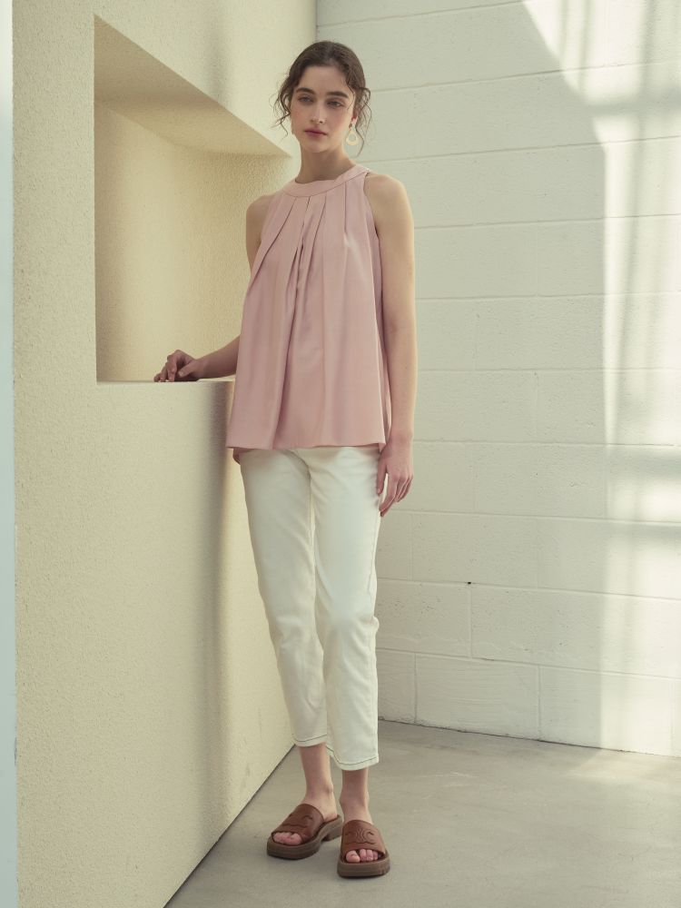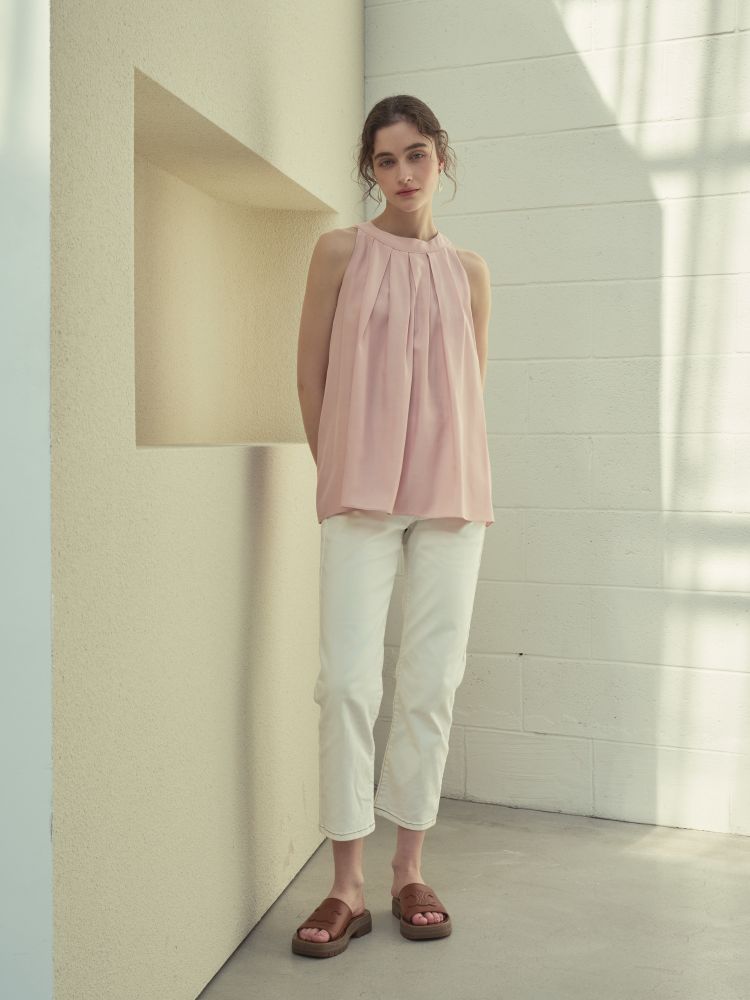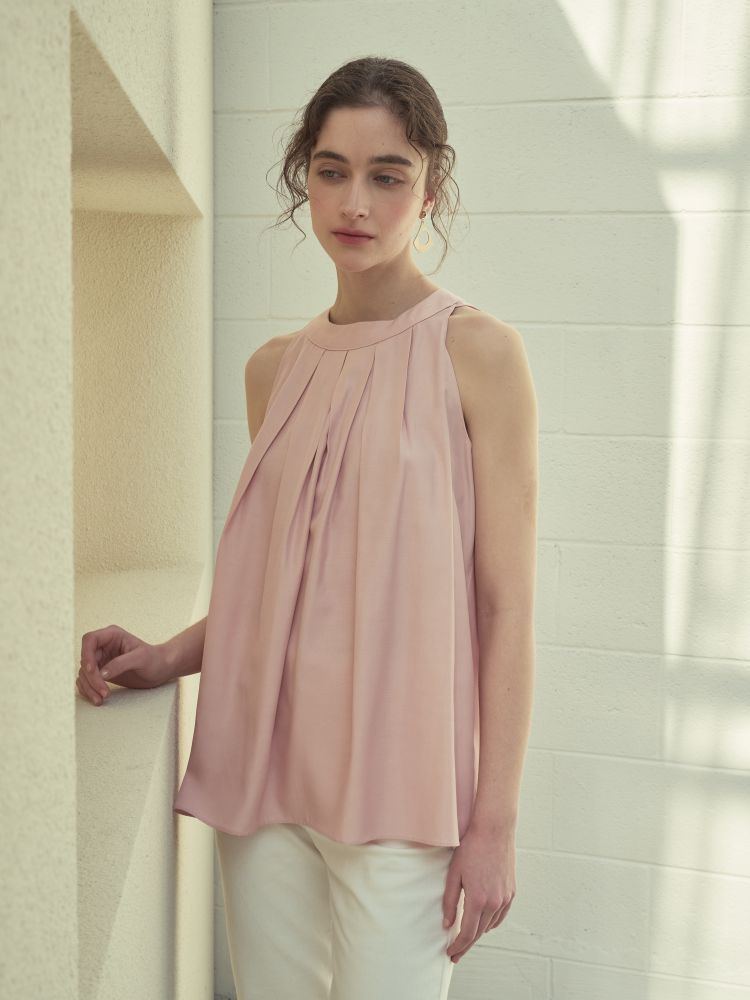고급 폴리소재. 핀탁디테일과 홀터넥 디자인으로 여성스러우며 다양하게 코디 활용 가능합니다.