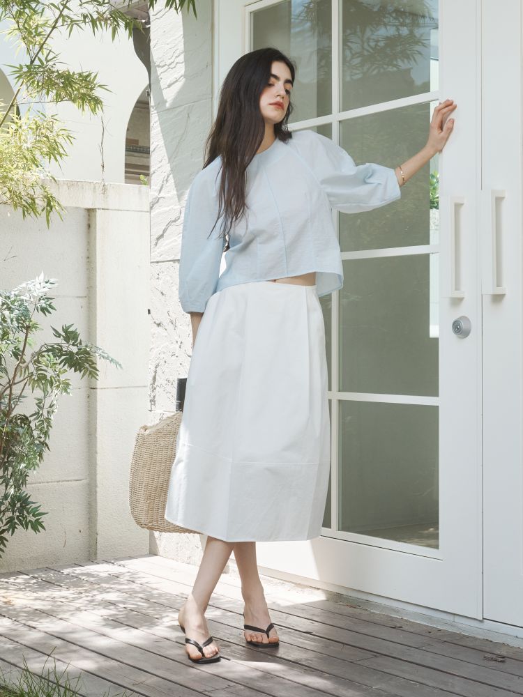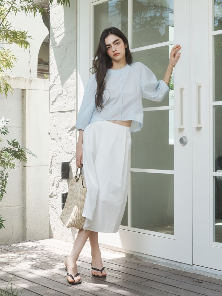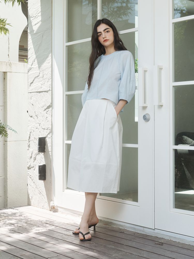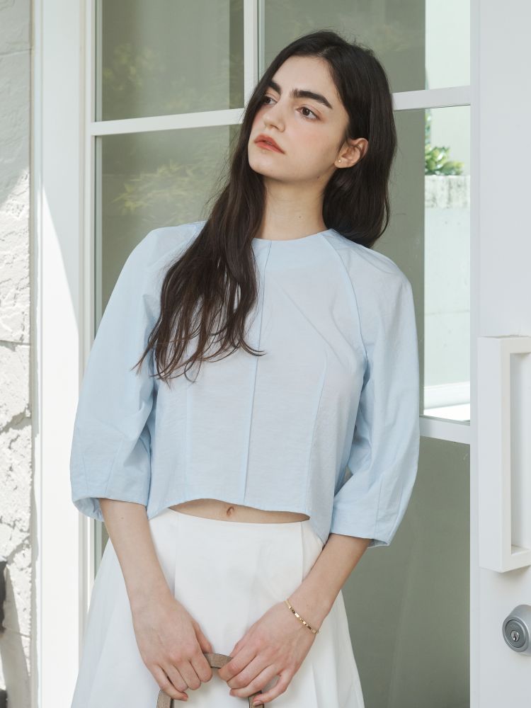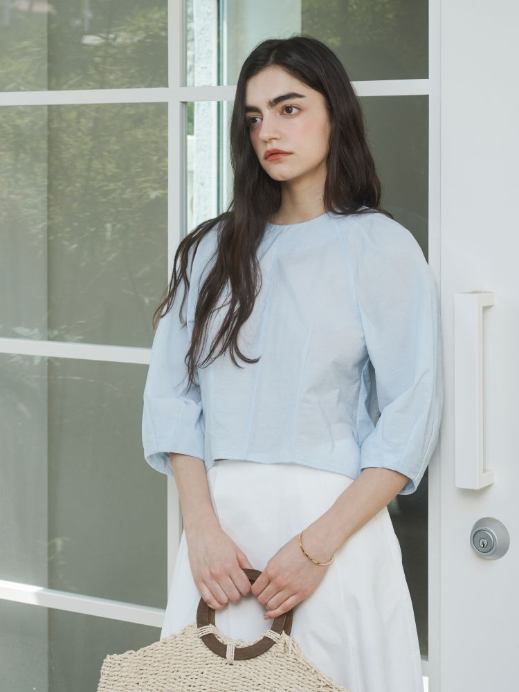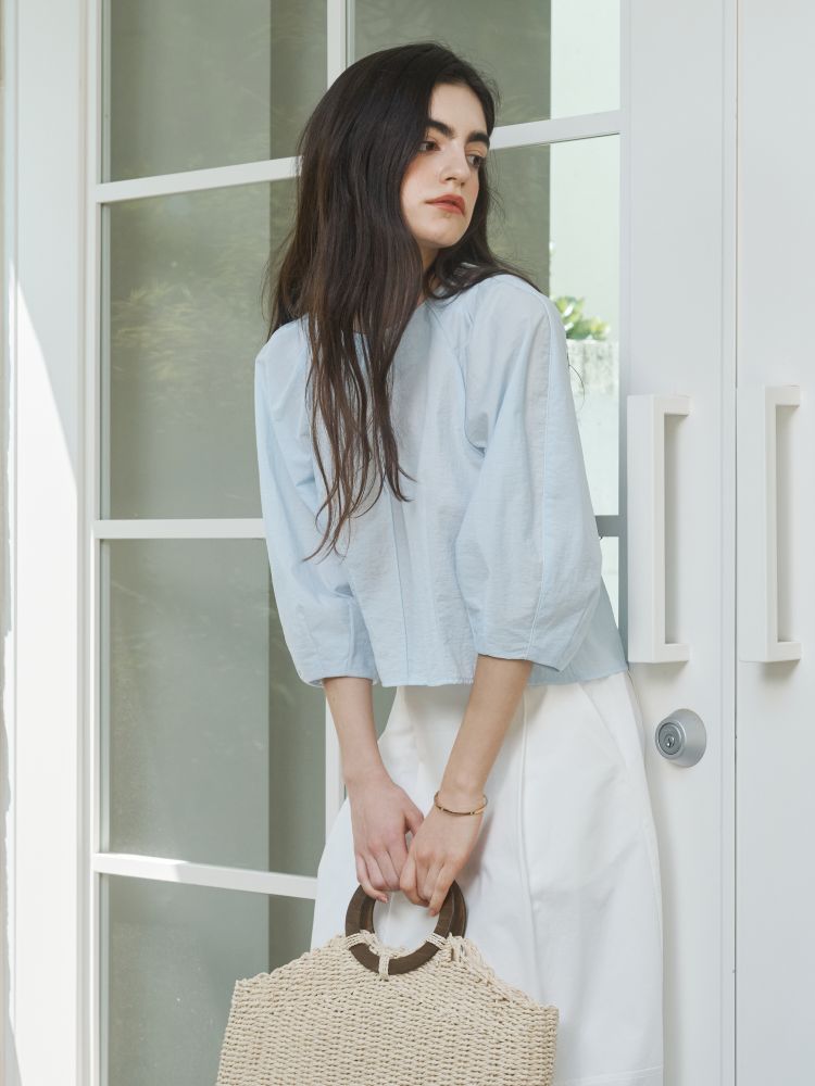 어깨선을 따라 다트선으로 이루어져 풍성한 소매와 볼륨감이 느껴지는 블라우스입니다.
