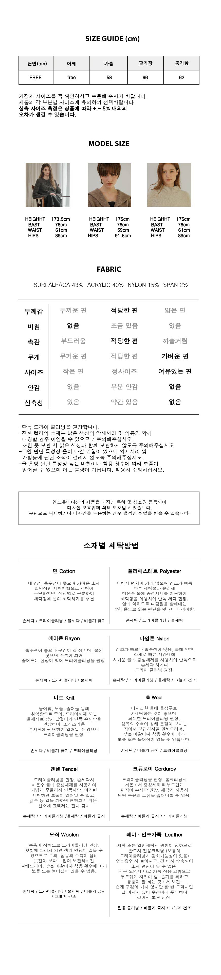 Dry Cleaning Only(첫 세탁은 드라이클리닝을 권장하며 찬물 손세탁을 권장합니다. 세탁 시 의류에 부착된 케어라벨을 확인부탁드립니다.)