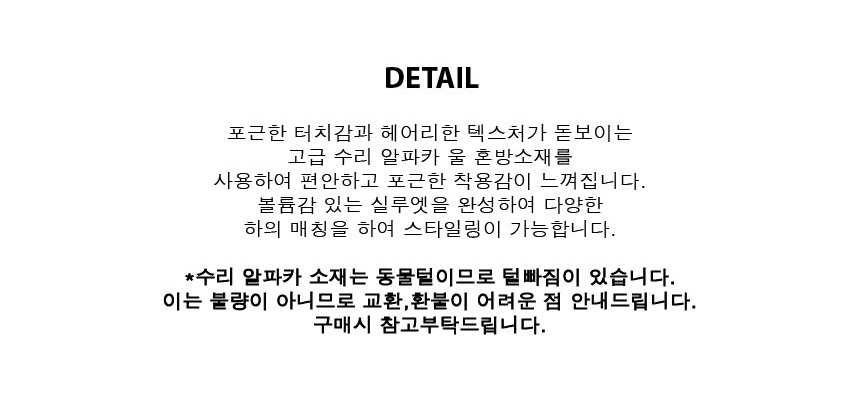 포근한 터치감과 헤어리한 텍스처가 돋보이는 고급 수리 알파카 울 혼방소재를 사용하여 편안한 착용감이 느껴집니다.