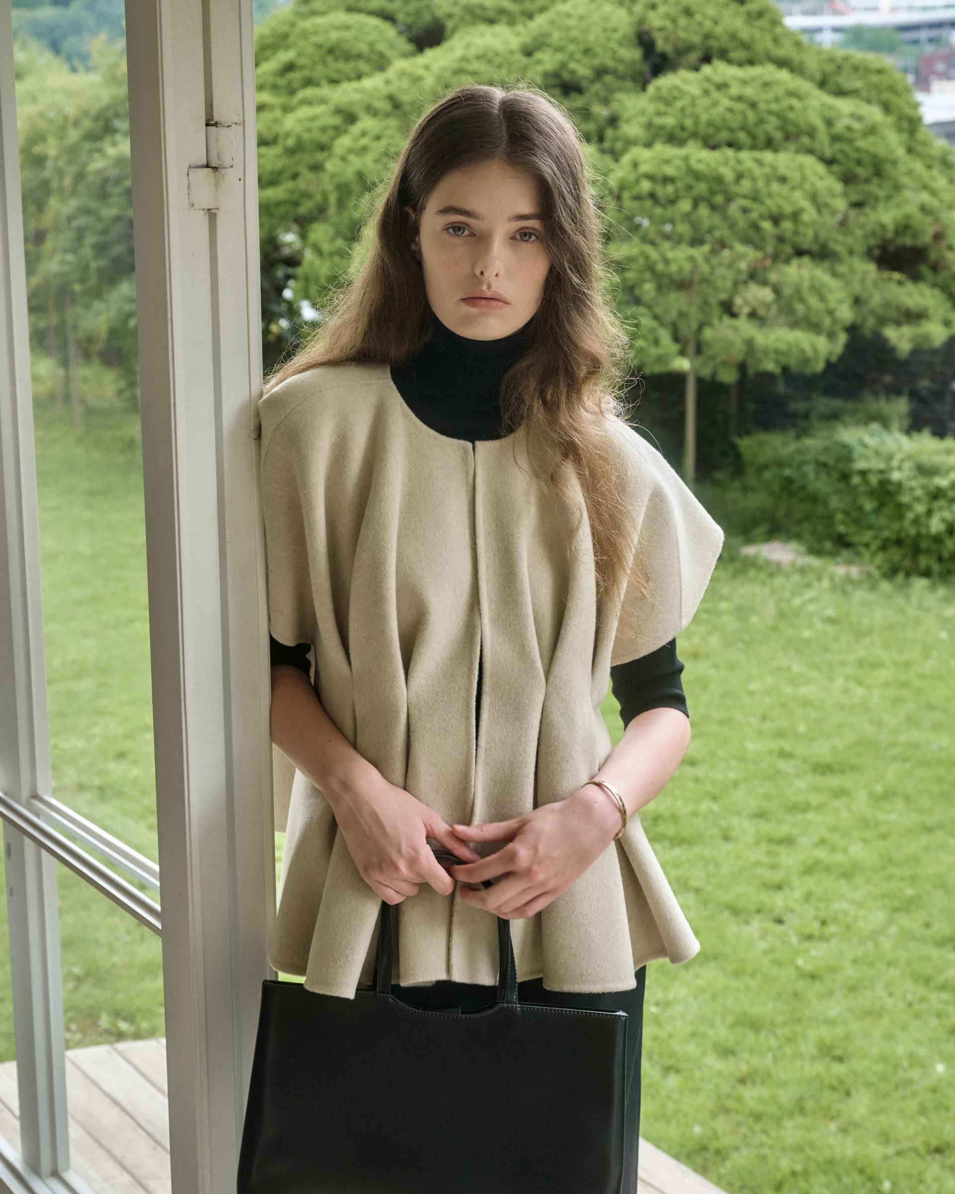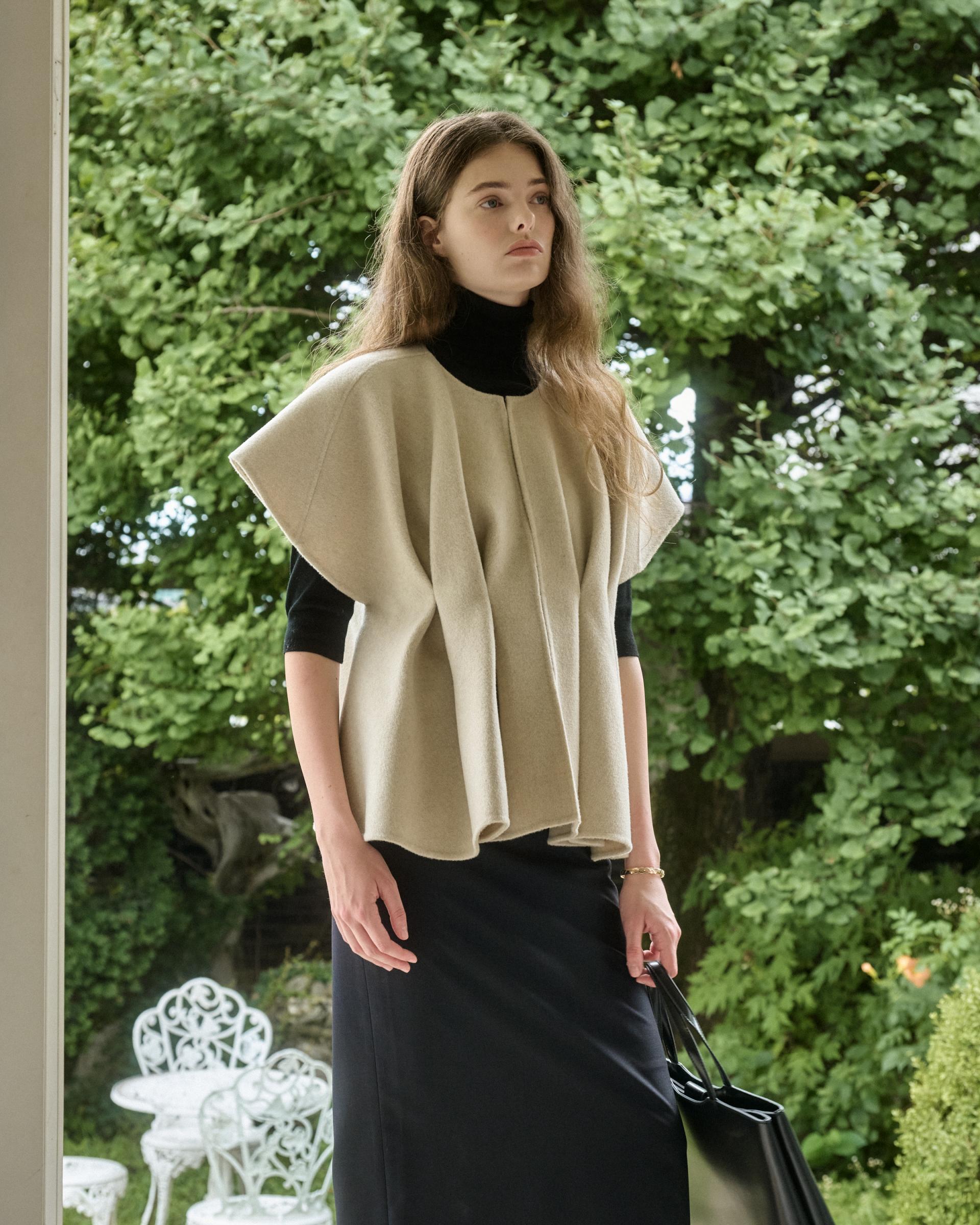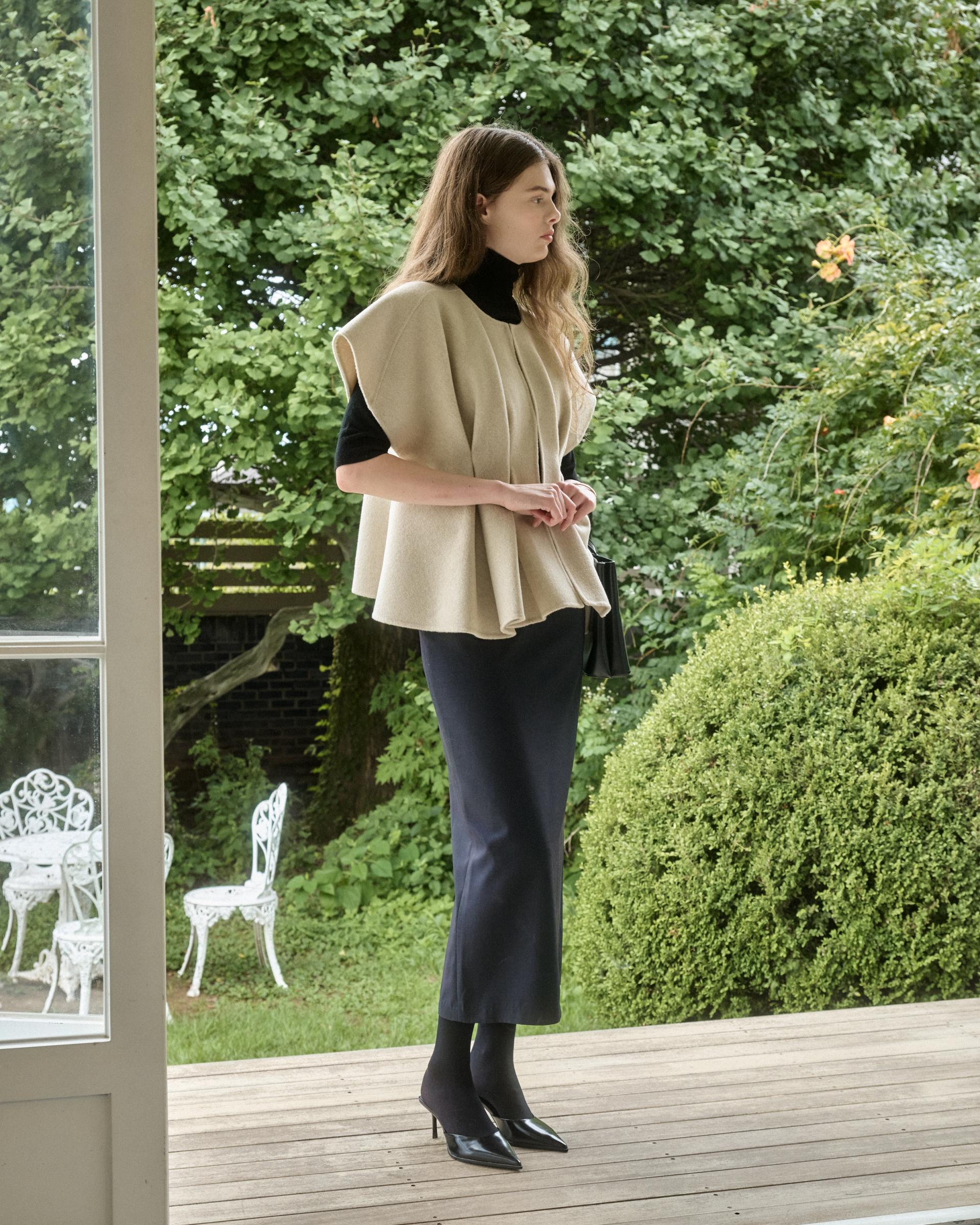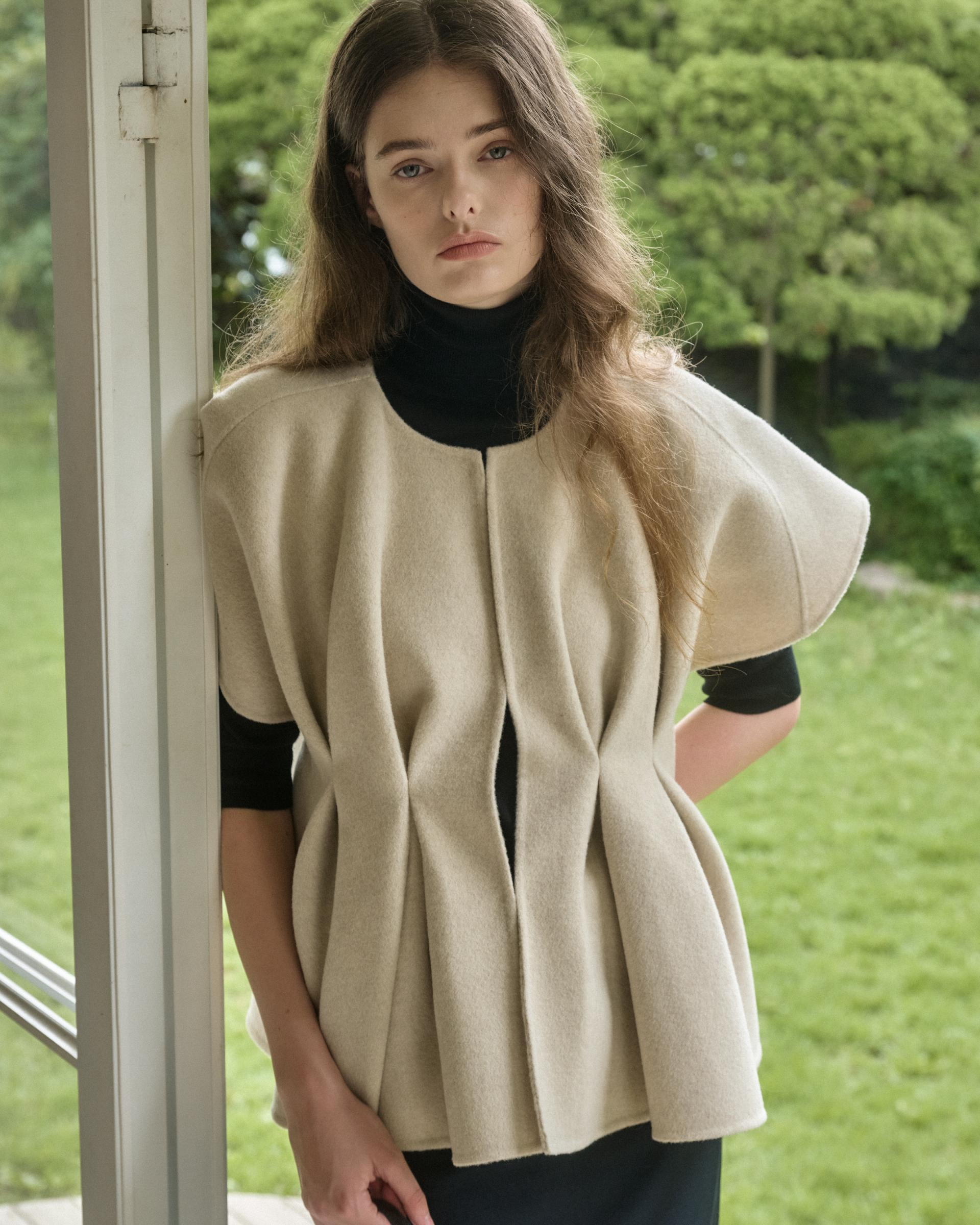 앞면 허리라인에 턱을 잡아 볼륨감 있는 실루엣을 연출해주는 핸드메이드 베스트 자켓입니다.