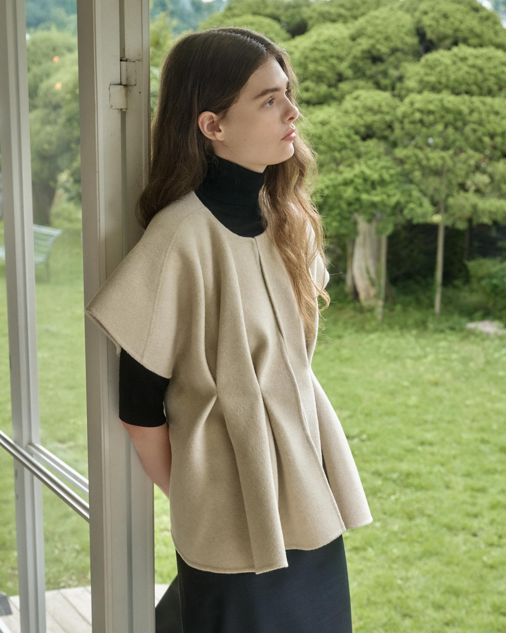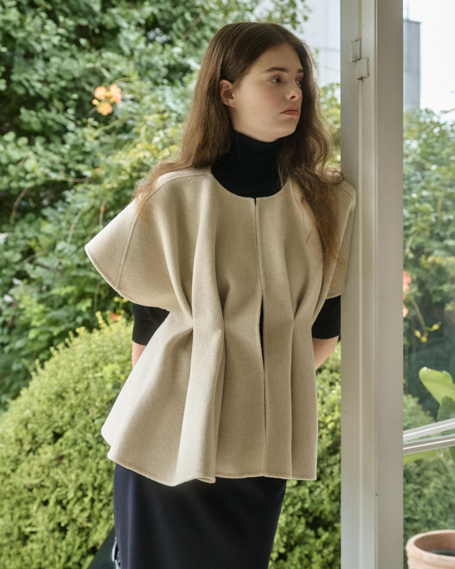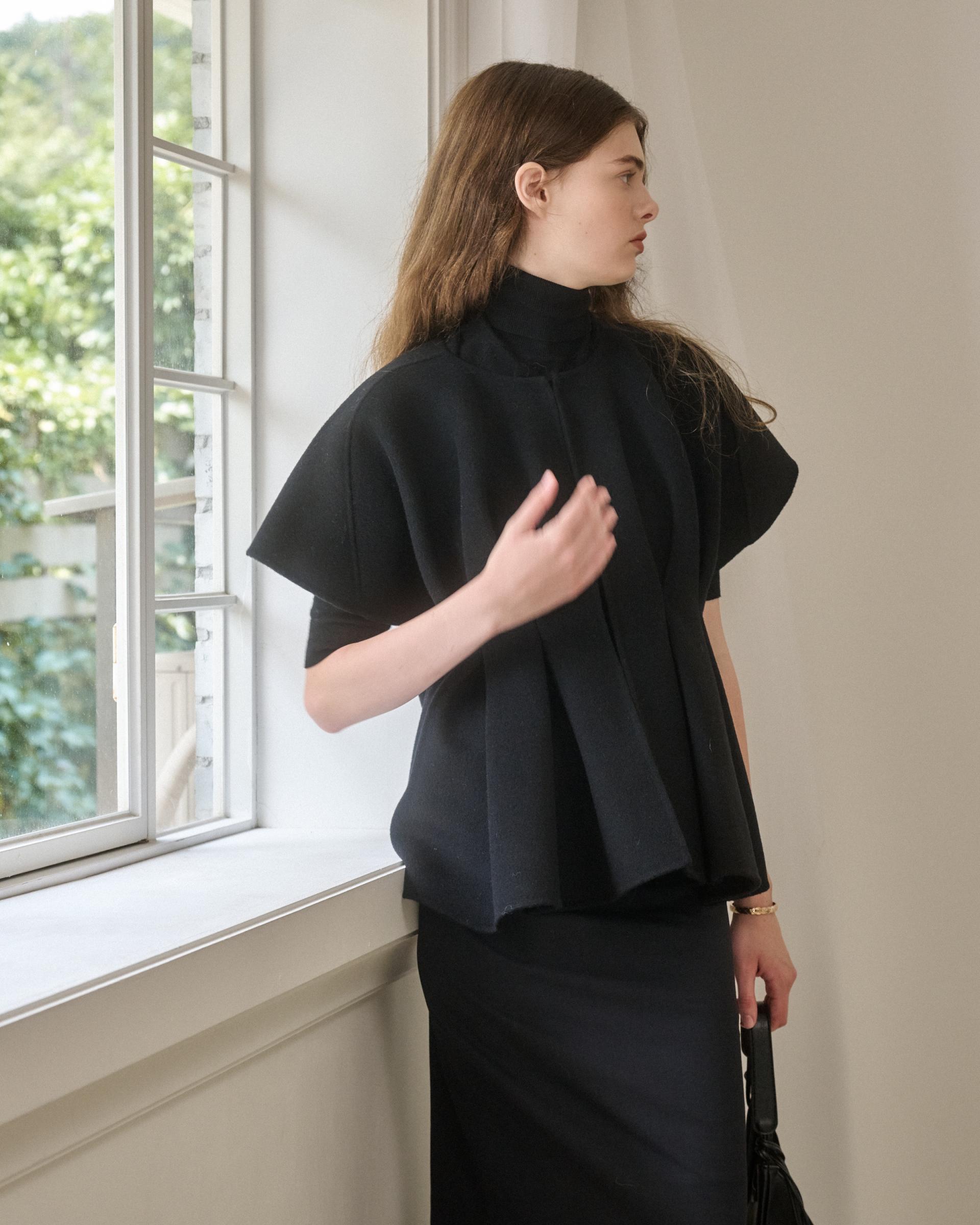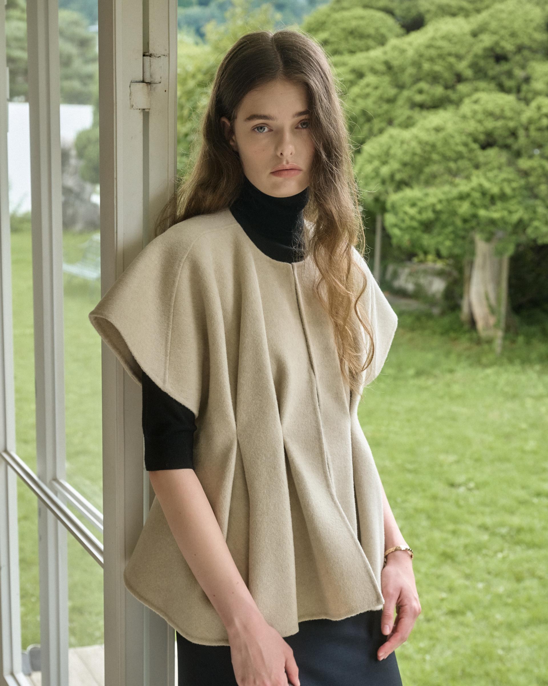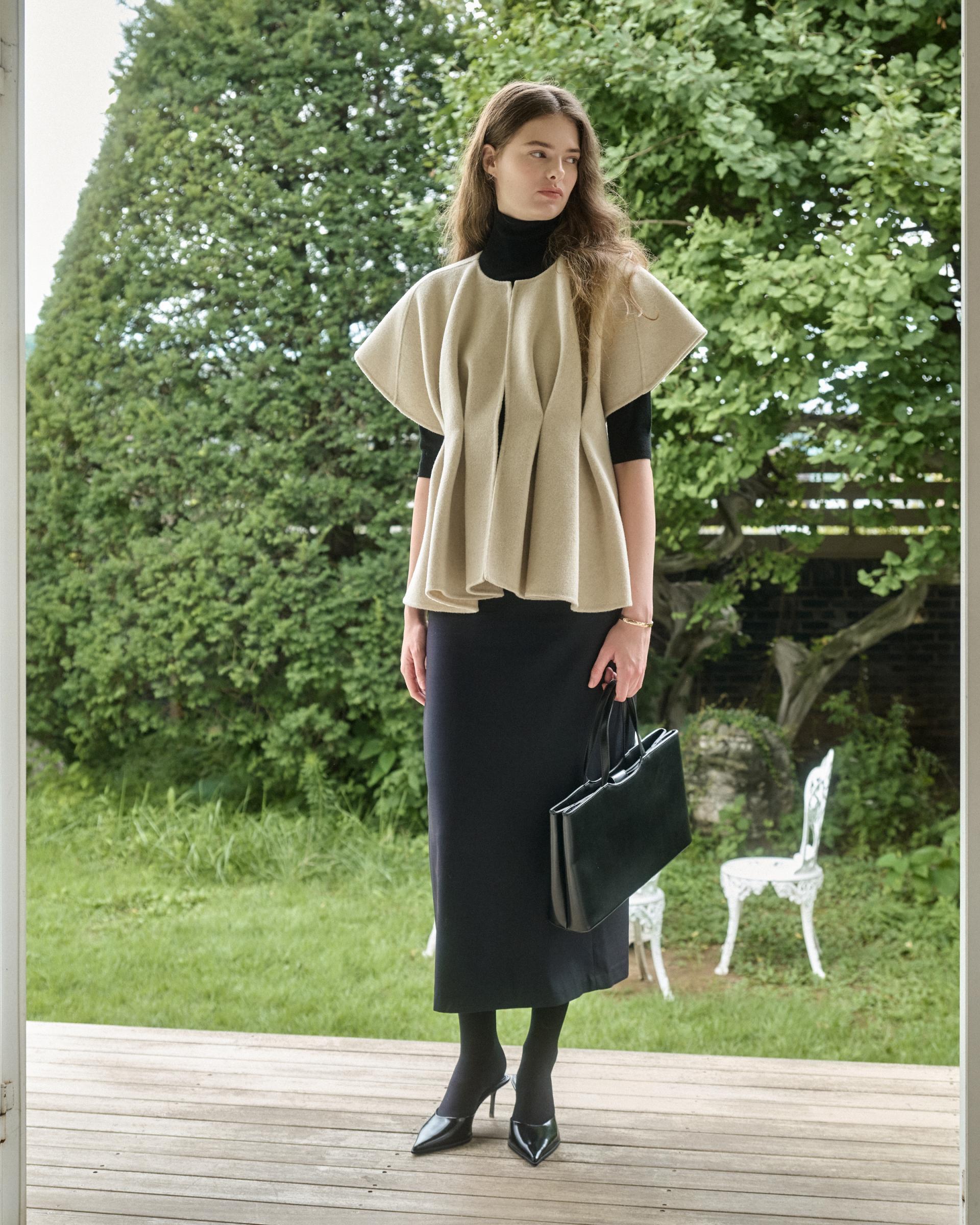 앞면 허리라인에 턱을 잡아 볼륨감 있는 실루엣을 연출해주는 핸드메이드 베스트 자켓입니다.