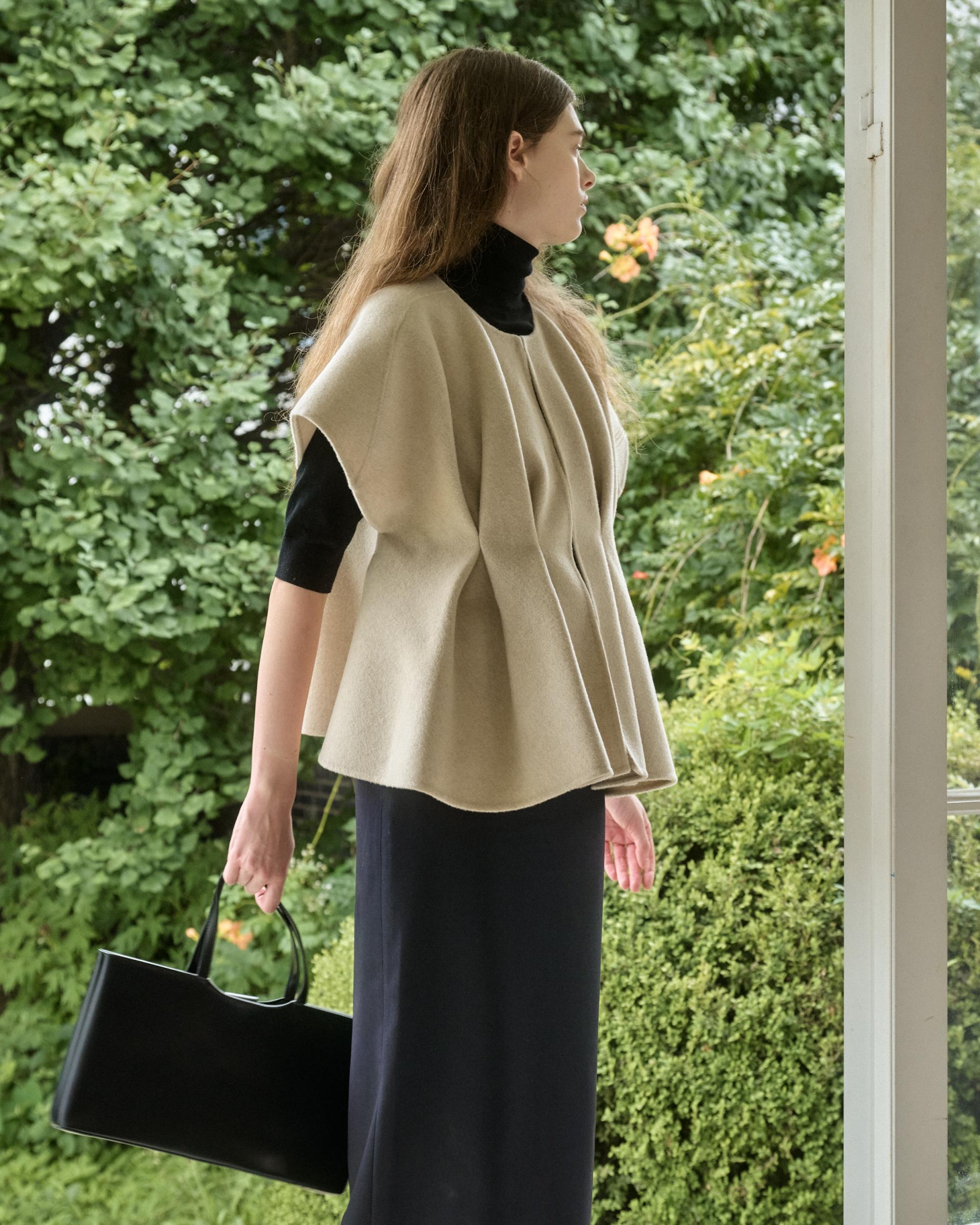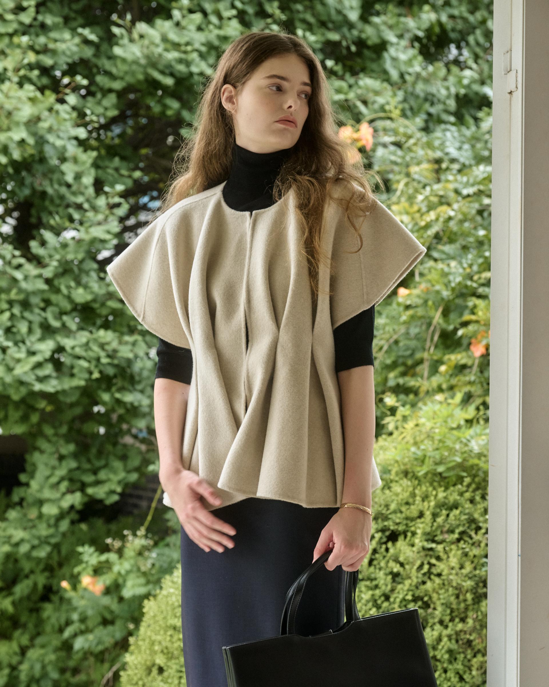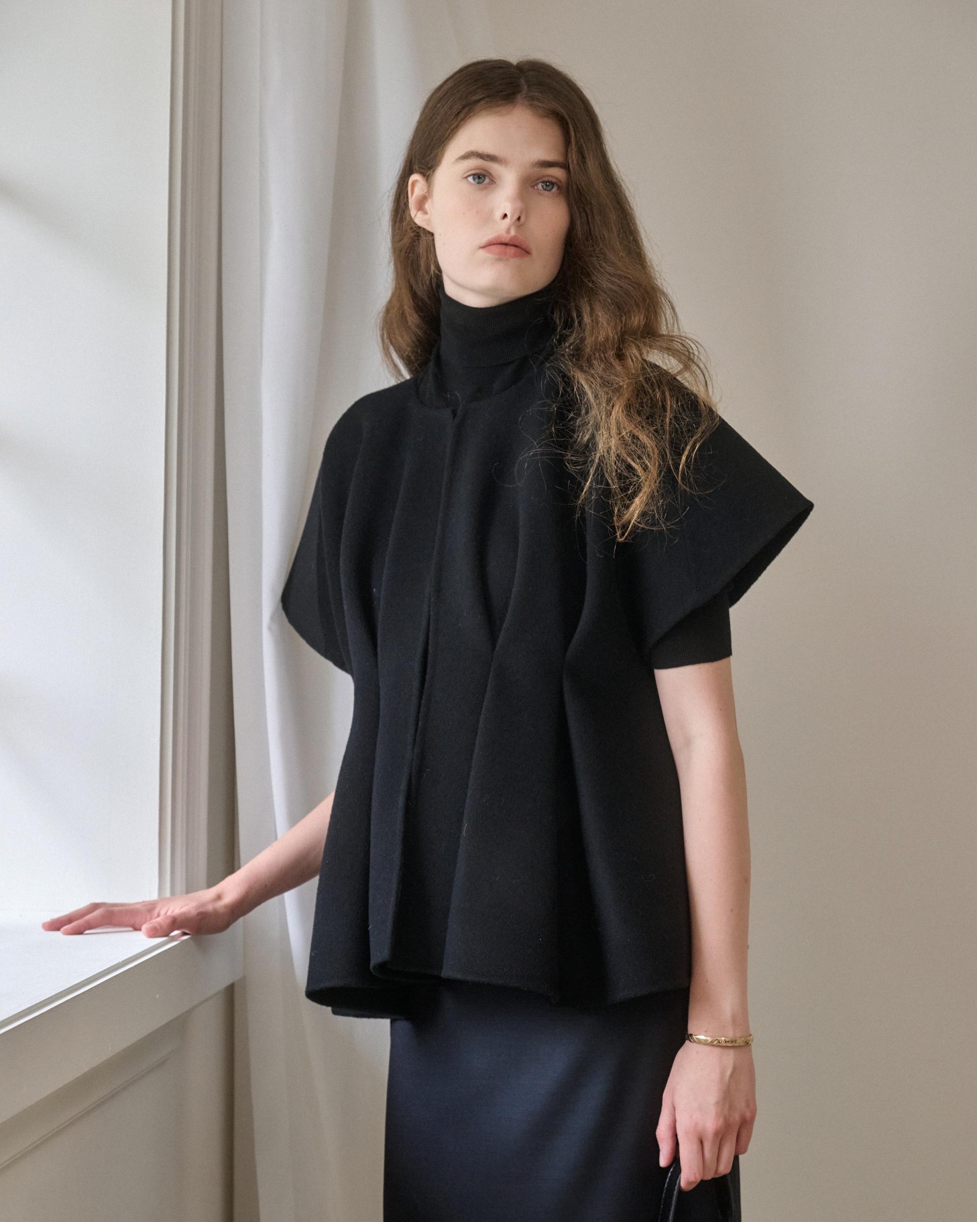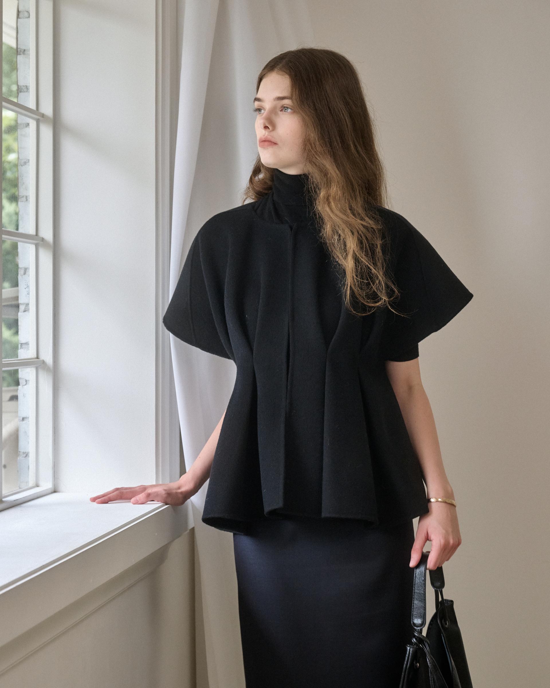 앞면 허리라인에 턱을 잡아 볼륨감 있는 실루엣을 연출해주는 핸드메이드 베스트 자켓입니다.