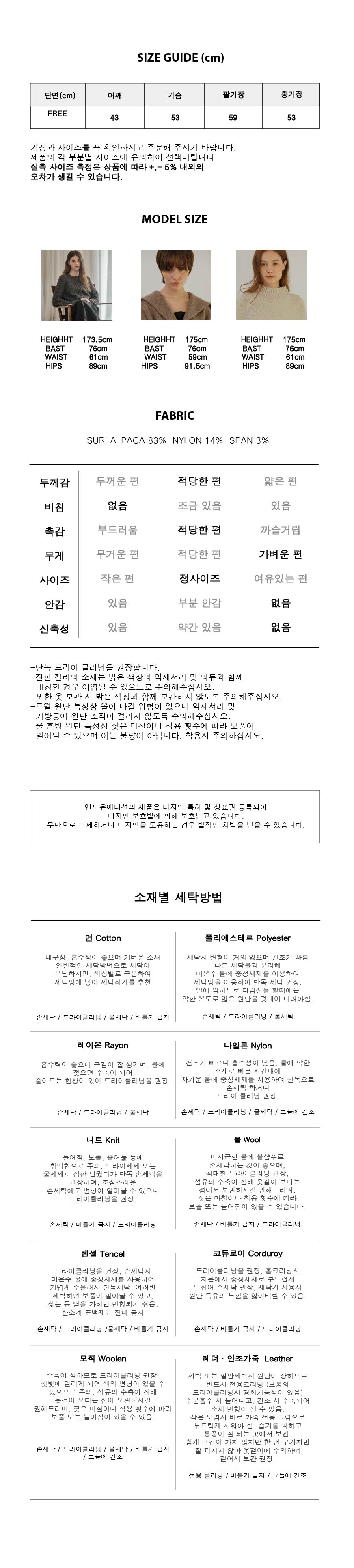Dry Cleaning Only(첫 세탁은 드라이클리닝을 권장하며 찬물 손세탁을 권장합니다. 세탁 시 의류에 부착된 케어라벨을 확인부탁드립니다.)